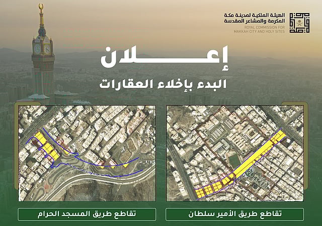 بدأت الهيئة الملكية لمدينة مكة المكرمة والمشاعر المقدسة، أمس، في إخلاء العقارات المنزوعة لصالح مشروع الدائري الثالث، "تقاطع طريق الأمير سلطان وتقاطع طريق المسجد الحرام"، وذلك بناءً على المادة السابعة عشر من نظام نزع ملكية العقارات للمنفعة العامة، ووضع اليد المؤقت.
