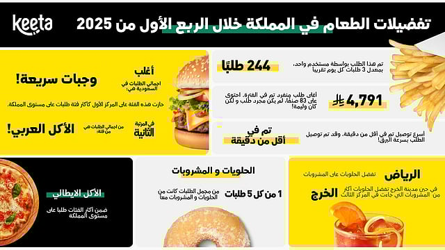أعلنت "كيتا"، الذراع الدولية لشركة "ميتوان" الصينية العملاقة في خدمات التوصيل حسب الطلب، عن تقريرها للربع الأول من عام 2025، كاشفة عن توجهات طلبات السعوديين، وما يطلبونه، وأين تتغيّر الذائقة، وكيف أصبحت خدمات التوصيل جزءًا لا يتجزأ من الحياة اليومية. وبشبكة تضم أكثر من 30,000 سائق توصيل و25,000 مطعم شريك في أنحاء المملكة، قدم "كيتا" الآن بيانات فورية تعكس تفضيلات المستهلكين وأنماطهم الغذائية المتنوعة.