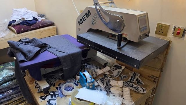 وأضاف "بخش" أنه تم أيضا ضبط كميات جاهزة للتوزيع، بالإضافة إلى (5) طابعات "إستكرات" حرارية و(15) ماكينة خياطة و(5) مكائن طباعة ورقية، وأكثر من (200,000) ملصق لعلامات تجارية عالمية، إلى جانب من "تيشيرتات" خام ومطبوعة جاهزة للتوزيع.