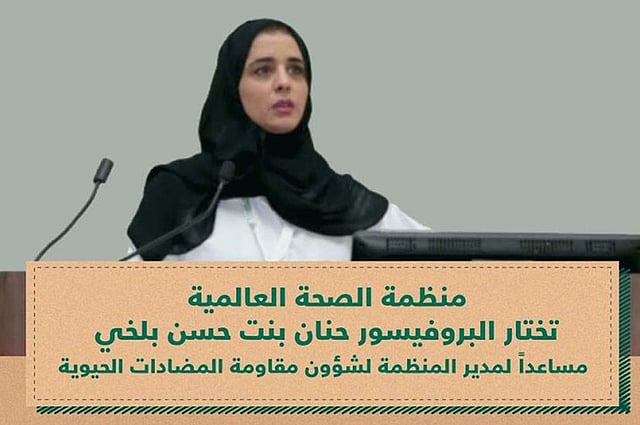 وكانت وزارة الحرس الوطني أعلنت، أمس الخميس، تعيين المدير التنفيذي لإدارة مكافحة العدوى بشؤونها الصحية، الدكتورة حنان بلخي، في منصب مساعد مدير منظمة الصحة العالمية لشؤون مقاومة المضادات الحيوية.