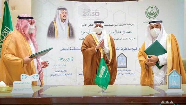 برعاية الأمير محمد بن عبدالرحمن بن عبدالعزيز، أمير منطقة الرياض بالنيابة، وقع عميد كلية التربية الدكتور أحمد بن محمد النشوان مذكرة تفاهم مع الإدارة العامة للتعليم في منطقة الرياض.