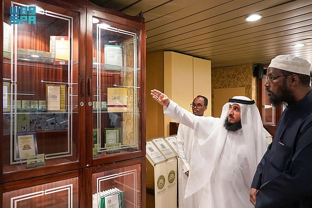 واستمع الشيخ لشرحٍ موجز عن مهام المجمع وأعماله المتخصصة في طباعة المصحف الشريف، مُطّلعًا على عددٍ من إصداراته المتنوعة، شملت مصاحف بأحجام وروايات مختلفة، إلى جانب ترجمات معاني القرآن الكريم بعدة لغات عالمية، في تجسيدٍ للدور الريادي الذي تقوم به المملكة في إيصال رسالة القرآن الكريم إلى شعوب العالم.