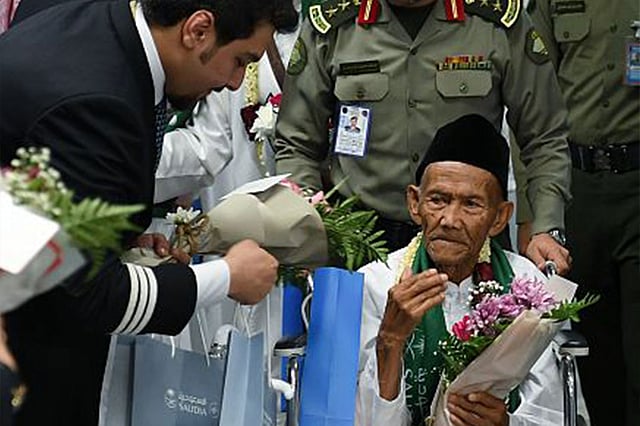 استقبلت صالة الحجاج بمطار الملك عبدالعزيز الدولي بجدة، اليوم الأربعاء، المعمر الإندونيسي الحاج أوهي عيدروس سمري (130 عامًا) الذي وجه خادم الحرمين الشريفين الملك سلمان بن عبدالعزيز، لاستضافته خلال موسم حج هذا العام هو وعائلته المكونة من سته أشخاص، ضمن برنامج ضيوف خادم الحرمين الشريفين للحج والعمرة.