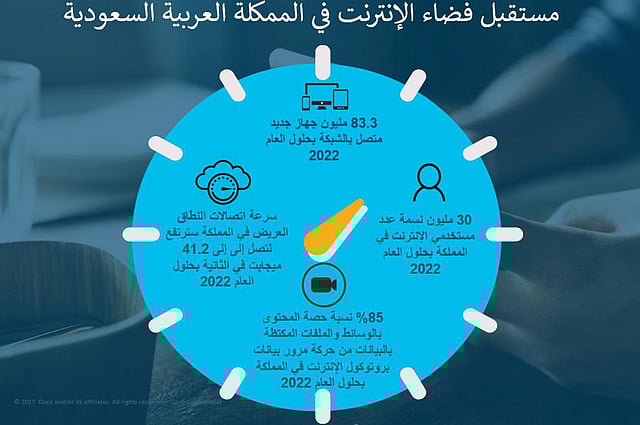 وتقدر سيسكو أن منطقة الشرق الأوسط وشمال إفريقيا ستحتضن نحو 549 مليون مستخدم، وسيكون لها السبق على المستوى العالمي بأعلى معدل لنمو حركة بيانات بروتوكول الإنترنت بارتفاعها بنسبة 41% من 2017 إلى 2022.
