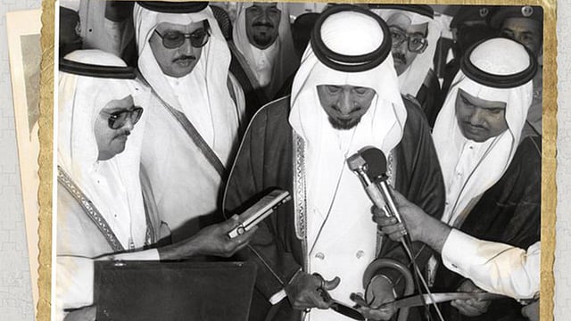 نشرت دارة الملك عبد العزيز، صورة نادرة للملك خالد بن عبدالعزيز، وهو بجوار الأقمار أثناء افتتاحه محطة الصناعية في ديراب.