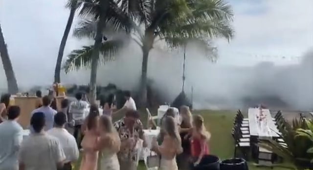 أظهرت لقطات فيديو اقتحام موجة عملاقة لحفل زفاف مقيم في قصر على جزيرة في هاواي الأمريكية، لتضرب العروسين والحضور وتفسد "ليلة العمر"، لكن لحسن الحظ لم يصب أحد بأذى.