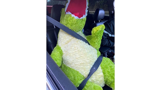 وذكر «يو بي آي» أنَّ الشُرطي سُرعان ما اكتشف أثناء توقف الإشارة أنَّ الراكب الوحيد بجانب السَّائق هو مُجرد دمية ضخمة لديناصور أخضر اللون. ومن ثم، لا يجوز لقائد المركبة المرور من حارة سيارات المرافقين.