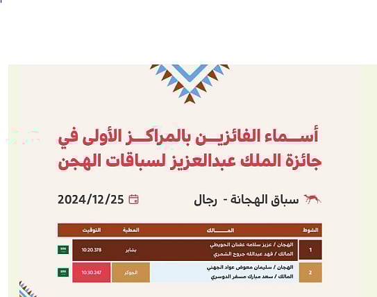 الإعلان عن الفائزين بجائزة الملك عبدالعزيز لسباقات الهجن فئة "الهجانة"