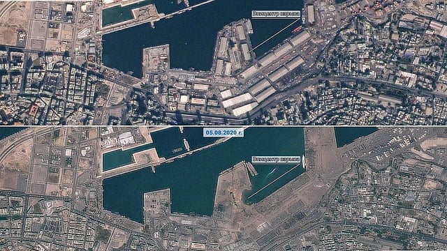 ونشرت وكالة الفضاء الروسية (روس كوسموس)، اليوم، صورتين فضائيتين لمرفأ بيروت، تسمح بمقارنة مظهر الموقع قبل وبعد الانفجار.