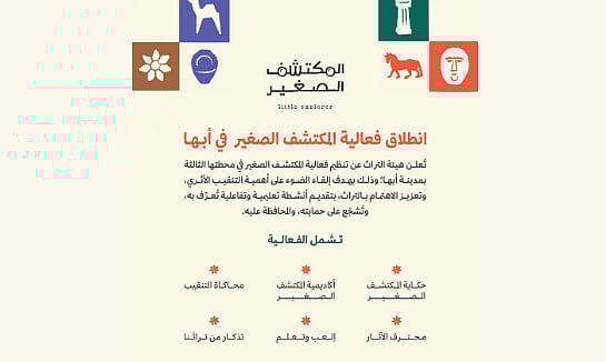 أطلقت هيئة التراث أمس، فعالية "المكتشف الصغير" في محطتها الثالثة بمدينة أبها، المستمرة لغاية 26 يوليو الجاري في قرية المفتاحة، ضمن جهودها الرامية إلى ربط الأجيال الناشئة بالموروث الحضاري الوطني وتعريفهم بمكونات الهوية الثقافية السعودية.