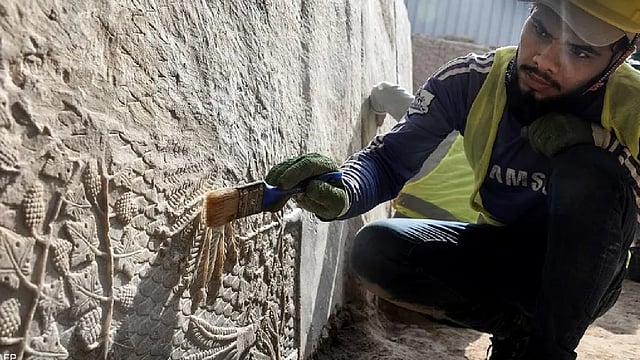 وأوضح فاضل محمد، مدير أعمال الترميم أن الفريق فوجئ باكتشاف 8 منحوتات جدارية بها نقوش ورسوم زينة وكتابات، مضيفًا أن هذه الجداريات بُنيت أو صُنعت خلال عهد الملك سنحاريب، في إشارة إلى ملك الإمبراطورية الآشورية الجديدة الذي حكم من 705 إلى681 قبل الميلاد.