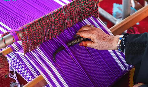 ويعتمد هذا الفن التقليدي على خامات محلية مثل صوف الغنم، وشعر الماعز، ووبر الإبل، حيث يمرّ بعدة مراحل تشمل الجزّ، والتنظيف، والغزل، والصباغة باستخدام مكونات طبيعية أبرزها الزعفران والحناء وجذور الأشجار، وصولًا إلى النسيج الغني بالزخارف الهندسية والألوان التراثية التي تعكس رموزًا من حياة البادية.