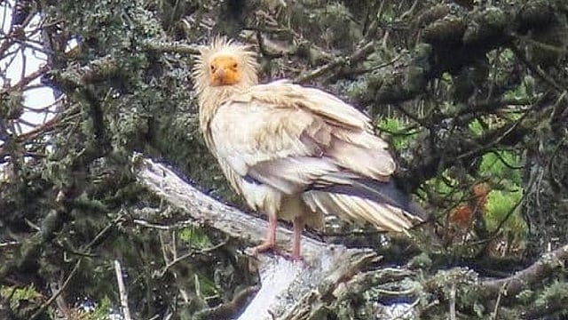 ورصد الطائر المفترس العملاق ذو الوجه الأصفر، للمرة الأخيرة، الاثنين، في تريسكو الواقعة بكورنوال بالمملكة المتحدة، وهو على شجرة صنوبر.