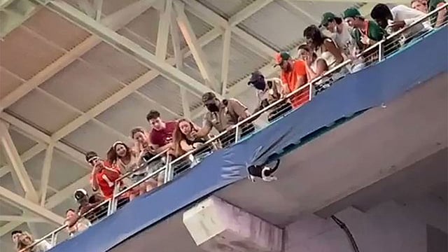 تفاعل الآلاف من الجماهير المتواجدين بملعب «هارد روك» الخاص بفريق ميامي دولفينس في دوري كرة القدم الأمريكية؛ وذلك بعد ما علقت أحد القطط في سلك المنصة في مباراة كرة قدم جامعية في فلوريدا ليلة السبت.