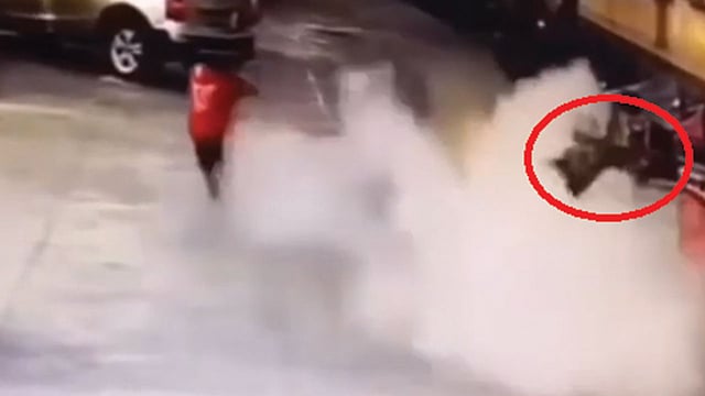 وعند انفجارها طار الطفل البالغ من العمر 8 سنوات عدة أمتار في الهواء، ثم ارتطم بالأرض دون حراك، ولكنه لم يفقد حياته، بحسب ما ذكرت صحيفة «نيويورك بوست» الأمريكية، وإنما أصيب بجروح طفيفة.