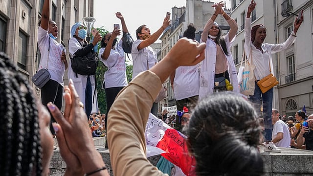 وخرجت تظاهرات حاشدة شارك فيها قرابة المئة ألف شخص في العاصمة باريس، حيث جالت مسيرات شارك فيها أعضاء من تيارات اليمين واليسار المتطرف وأفراد من الأطقم الطبية ونشطاء مدنيين وغيرهم، وكذلك خرجت مسيرات في ستراسبورغ بالشرق، وليل الشمالية، ومونبلييه في الجنوب وأماكن أخرى، حسب إذاعة «صوت أمريكا».
