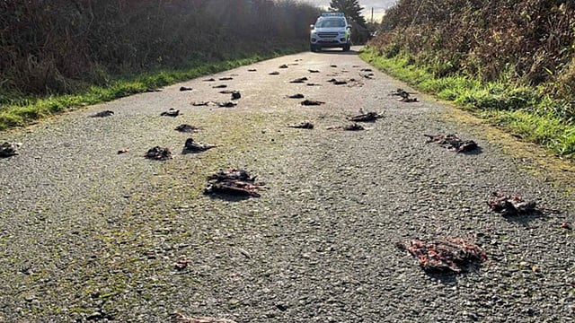 وتابع التقرير: «تم العثور على 225 من الطيور على الطريق بعد ظهر يوم الثلاثاء مع العديد من الطيور الأخرى؛ دون وجود حالات مشابهة في الحقول القريبة».
