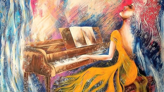 في لوحتها “سيلوسيا”، ابتكرت آلاء مجموعة كاملة من متطلبات الحياة، وذلك من خلال تشكيل امرأة راقصة محاطة بعناصر الطبيعة المتمثلة بطائر، أمواج بحر عاصفة، أزهار، غصن شجرة وإوزة.