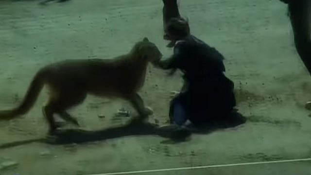 الضابطة لم ترهبها المفاجأة وتمالكت نفسها بسرعة، ورفعت يدها في وجهه ولكمته على فمه لتصاب بجرح بسبب أنيابه، قبل أن يتجمع زملاؤها ويركله أحدهم بقدمه، ليلوذ الأسد بالفرار.