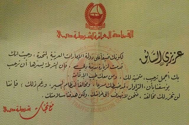 وجاء في الرسالة ما يلي: «عزيزي السائق، لكونك ضيفاً على دولة الإمارات العربية المتحدة، وحيث إنك قدمت لزيارة مدينة دبي، فإن الشرطة يسرها أن ترحب بك أجمل ترحيب، متمنية لك ومن معك طيب الإقامة».