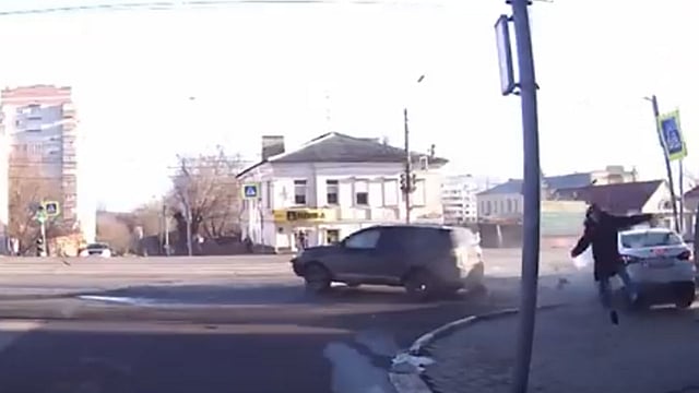 نجا شاب روسي من موت محقَّق، عندما اندفعت باتجاهه سيارة مسرعة، عقب اصطدامها بأخرى؛ لتعتلي الرصيف الذي كان يقف عليه الشاب.