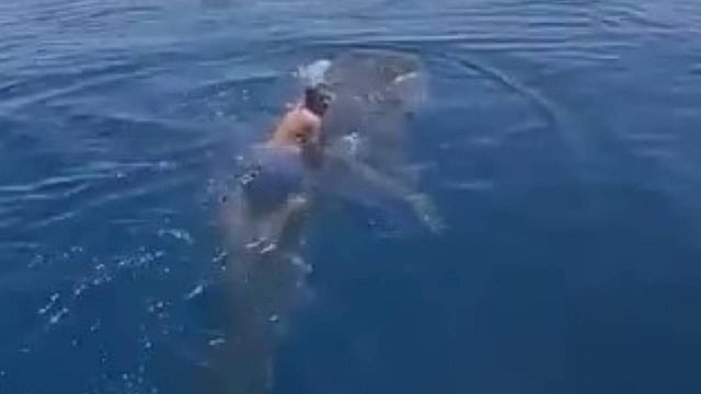 الفيديو الذي انتشر عبر مواقع التواصل الاجتماعي أظهر الشابَّ وهو على ظهر مركب بجوار سمكة الحوت السابحة بجواره قبل أن يقوم بالقفز على ظهرها والسباحة بها.