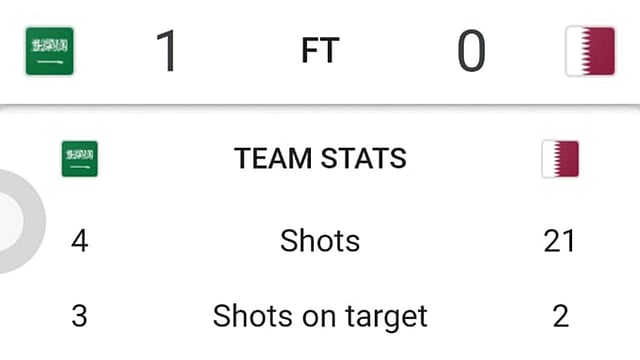 ومن بين 21 تسديدة على المرمى للفريق القطري، حصرها «جوجل»، مقابل 4 فقط للضيوف، كانت ذات الإحصائيات تكشف، أنها جميعا طاشت بعيدا عن مرمى فواز القرني باستثناء كرتين فقط، بينما تسديدات الأخضر الـ4 جاءت 3 منها ما بين القائمين والعرضة، واستقرت واحدة منها في شباك سعد الشيب؛ ليدلل على نجاعة السعودية وفعالية الانطلاق المركَّز من الخلف للأمام.
