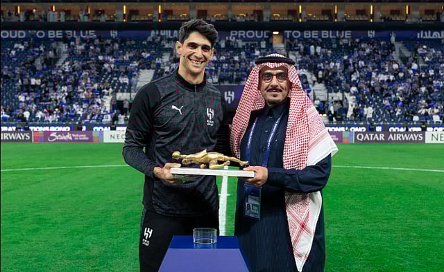 كرم رئيس مجلس إدارة شركة نادي الهلال، الأمير نواف بن سعد، حارس الفريق ياسين بونو، بعد حصوله على جائزة أفضل حارس أفريقي لعام 2025، قبيل مباراة الهلال أمام الشرطة العراقي.