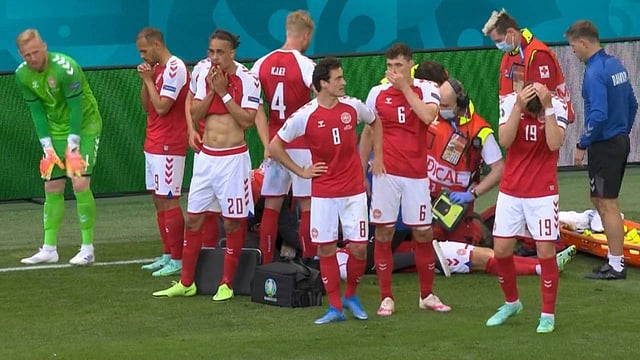 ودخل الجهاز الطبي لمنتخب الدنمارك سريعًا إلى أرضية الملعب برفقة فرقة الإسعاف لمحاولة إنقاذ اللاعب وسط ذعر من جميع لاعبي المنتخبين والجماهير المتواجد في المدرجات.