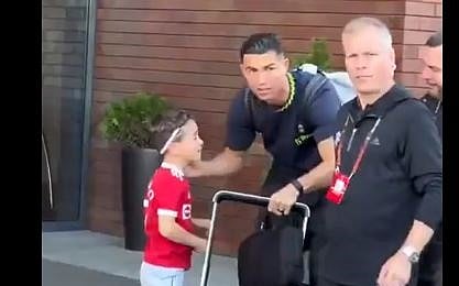وبعدها طلب رونالدو الحصول على قلم واصطحب الطفل معه إلى باب الحافلة ووقع له على القميص الخاص به واحضتنه ثم ودعه.