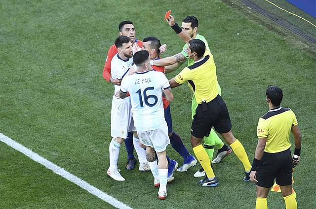 وقال ميسي بعد طرده من مباراة تحديد المركزين الثالث والرابع بكوبا أمريكا أمام تشيلي: «لا ينبغي أن نكون جزءًا من هذا الفساد، لم يظهروا لنا أي احترام طيلة البطولة، المحزن أن الفساد والحكام لا يسمحون للناس بالاستمتاع بكرة القدم، لقد أفسدوها».