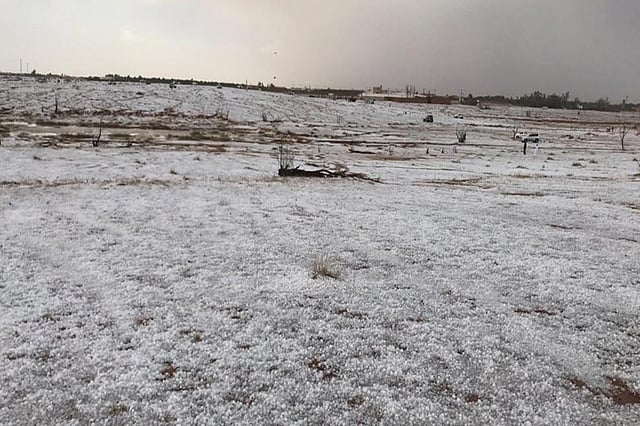 ويوضّح مقطع الفيديو، الذي حصلت عليه «عاجل»، زخات البرد تكسو ملعب اللقاء، بينما نزل بعض المشجعين إلى أرضية الملعب فرحًا بزخات البرد.
