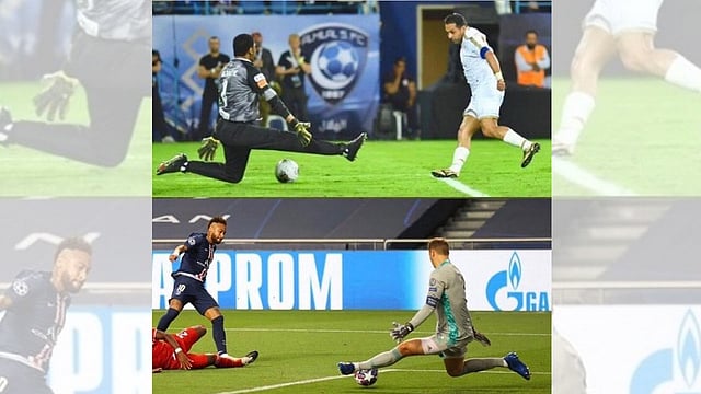 وأرفق حامي عرين الزعيم السابق صورته بأخرى لمانويل نوير حارس مرمى نادي بايرن ميونخ وهو يقوم بنفس التصدي أثناء مواجهة باريس سان جيرمان بنهائي دوري أبطال أوروبا.