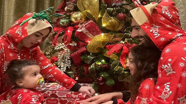 واحدة من هذه الصورة جمعت محمد صلاح بابنته مكة، والصورة الأخرى جمعته مع زوجته وابنته أمام شجرة «الكريسمس».