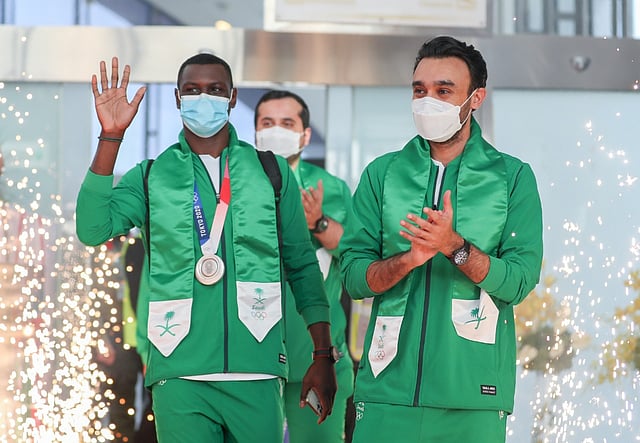وكان في استقبال البعثة نيابة عن أمير منطقة مكة المكرمة، الأمير سعود بن جلوي محافظ جدة المكلف، وعدد من مسؤولي وزارة الرياضة، وأعضاء مجلس إدارة اللجنة الأولمبية العربية السعودية، ووسائل الإعلام.