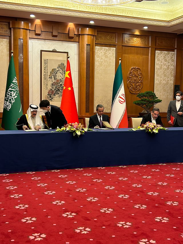 وأكد وزير الدولة عضو مجلس الوزراء مستشار الأمن الوطني الدكتور مساعد بن محمد العيبان، أن ترحيب خادم الحرمين الشريفين الملك سلمان بن عبدالعزيز آل سعود وصاحب السمو الملكي الأمير محمد بن سلمان بن عبدالعزيز آل سعود ولي العهد رئيس مجلس الوزراء -حفظهما الله- بالمبادرة الكريمة لفخامة الرئيس شي جين بينغ رئيس جمهورية الصين الشعبية لتطوير علاقات حسن الجوار بين المملكة العربية السعودية والجمهورية الإسلامية الإيرانية، يأتي انطلاقاً من نهج المملكة الثابت والمستمر منذ تأسيسها في التمسك بمبادئ حسن الجوار والأخذ بكل ما من شأنه تعزيز الأمن والاستقرار في المنطقة والعالم، وانتهاج مبدأ الحوار والدبلوماسية لحل الخلافات.