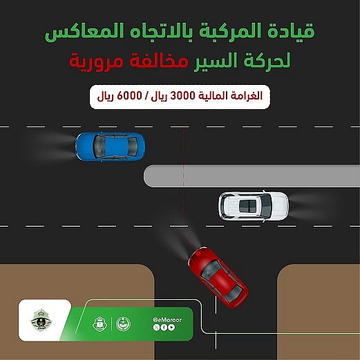 وأوضحت إدارة المرور، عبر منصة «إكس»، أن «قيادة المركبة بالاتجاه المعاكس الحركة السير مخالفة مرورية، وقيمة الغرامة المالية 3000 ريال / 6000 ريال».