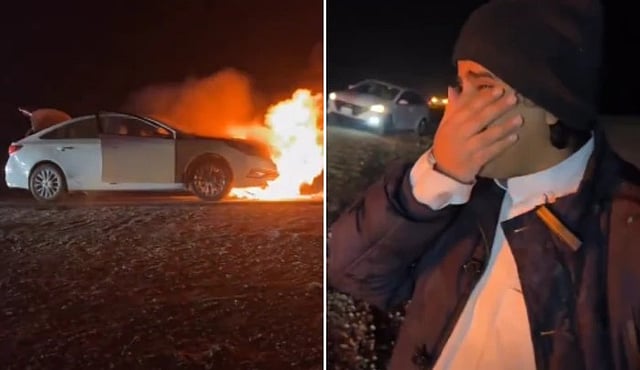 وظهر المواطن في المقطع المتداول، يقف أمام السيارة المحترقة يشاهدها أمام عينيه، وظل يروي تفاصيل الحادث، موضحًا أنه أثناء قيادته للسيارة بدأت في الاشتعال، وفجأة بدأ الدخان يخرج من السيارة، وتوقف فجأة.