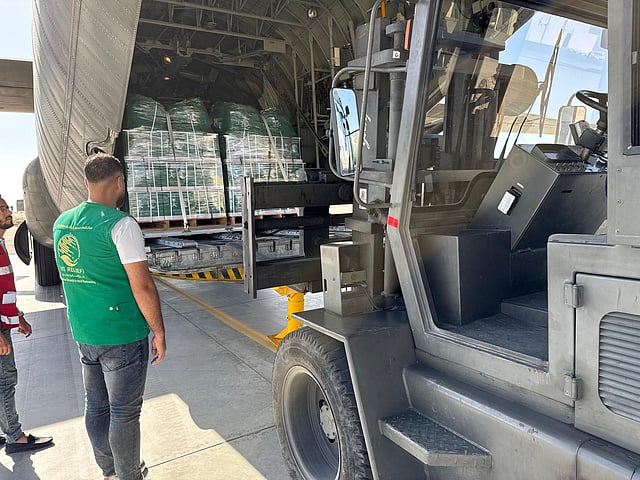 وتحمل الطائرة على متنها سلالًا غذائية وحقائب إيوائية، تمهيدًا لنقلها إلى المتضررين من الشعب الفلسطيني الشقيق داخل قطاع غزة.