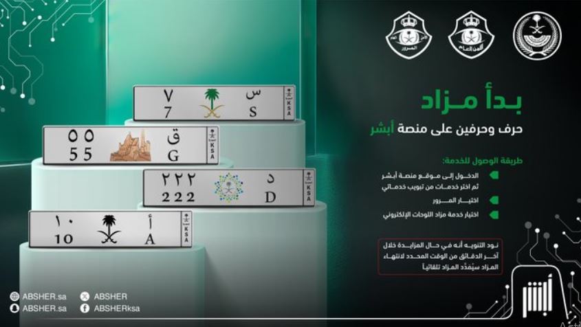 ويستمر مزاد اللوحات المميزة عبر منصة أبشر إلى يوم غد الخميس 18 يوليو.