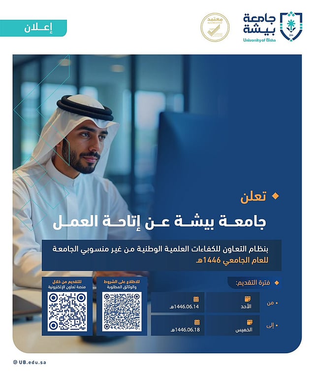 أعلنت جامعة بيشة عن إتاحة العمل بنظام التعاون للكفاءات العلمية الوطنية من غير منسوبي الجامعة للعام الجامعي 1446 حسب الشروط التالية: