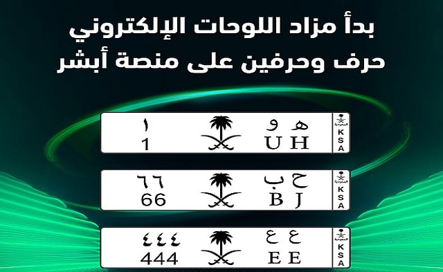 أطلقت منصة أبشر مزاد جديد للوحات المميزة الإلكترونية، وهو مزاد حرف وحرفين، والتي يمكن الحصول عليها من خلال موقع منصة أبشر طوال اليوم الثلاثاء.