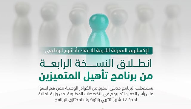 ويستهدف برنامج وزارة المالية الخريجين والخريجات ممن لم يمضِ على تخرجهم أربع سنوات من حملة البكالوريوس والماجستير، ومن ثم إلحاقهم بدورات تدريبية إلى جانب تدريبهم على رأس العمل في وزارة المالية لمدة 12 شهراً تنتهي بتوظيفهم، مع منحهم درجتين إضافيتين على المرتبة المستحقة حال اجتيازهم البرنامج بنجاح؛ إضافة إلى منحهم فرصاً مثمرة ومساعدتهم على صقل تجاربهم خلال فترة زمنية مختصرة.