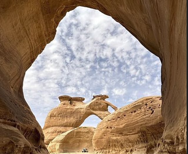 بتجويفات صخرية ممزوجة بالرمال الذهبية يحكي جبل "محجة" تاريخ وثقافة منطقة حائل ليصبح بذلك من المعالم الطبيعية البارزة في المنطقة.