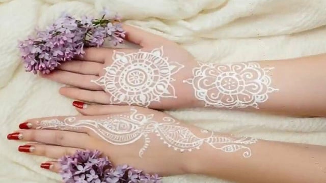 واحدة من أهم صيحات الموضة هذا العام هو استخدام الحنة البيضاء في رسم النقوش المختلفة للعروس، سواء رسومات على الكفوف أو الأقدام، أو أي منطقة أخرى من الجسم، وظهرت نقوشات الحنة البيضاء منذ عام 2016، ولكنها أصبحت موضة أساسية في بيوت التجميل هذا العام، حيث استخدمها الكثير من عرائس هذا الموسم، نظرًا لإطلالتها الساحرة التي تعطي للعروس مظهرًا وتألقًا مختلفًا.