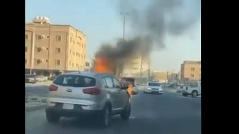 وظهر المواطن في مقطع الفيديو، وهو يقود المركبة إلى مكان بعيد وهي محترقة، وذلك قبل انفجارها واشتعال النار في المبنى السكني الذي كان قريبًا من المركبة.