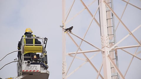 بالصور.. مدني الرياض ينقذ «صقرًا» علق بأحد أبراج الاتصالات