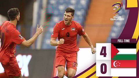 استعاد منتخب فلسطين نغمة الانتصارات في التصفيات المزدوجة المؤهلة إلى نهائيات كأس العالم 2022، وكأس آسيا 2023، بعدما دك مرمى نظيره السنغافوري برباعية قاسية، في المباراة التي جرت بينهما على ملعب الملك فهد الدولي، ضمن منافسات المجموعة الرابعة.