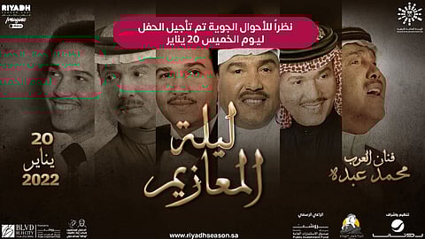 وقال «موسم الرياض»، عبر تويتر، إنه بسبب الأحوال الجويّة في الأيام الماضية على منطقة الرياض والأضرار التابعة لها، تم تأجيل ليلة المعازيم ليوم الخميس القادم 20 يناير.