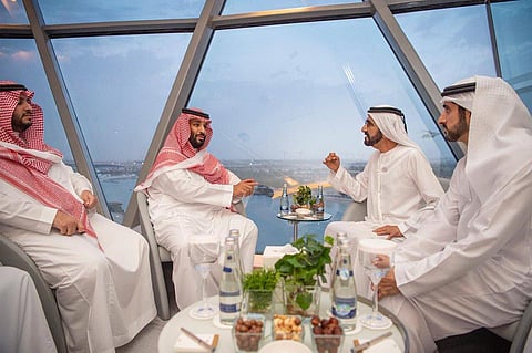 التقى صاحب السمو الملكي الأمير محمد بن سلمان بن عبدالعزيز، ولي العهد، نائب رئيس مجلس الوزراء، وزير الدفاع، اليوم، صاحب السمو، الشيخ محمد بن راشد آل مكتوم، نائب رئيس دولة الإمارات العربية المتحدة، رئيس مجلس الوزراء حاكم دبي، وسمو الشيخ حمدان بن محمد بن راشد آل مكتوم، ولي عهد دبي.